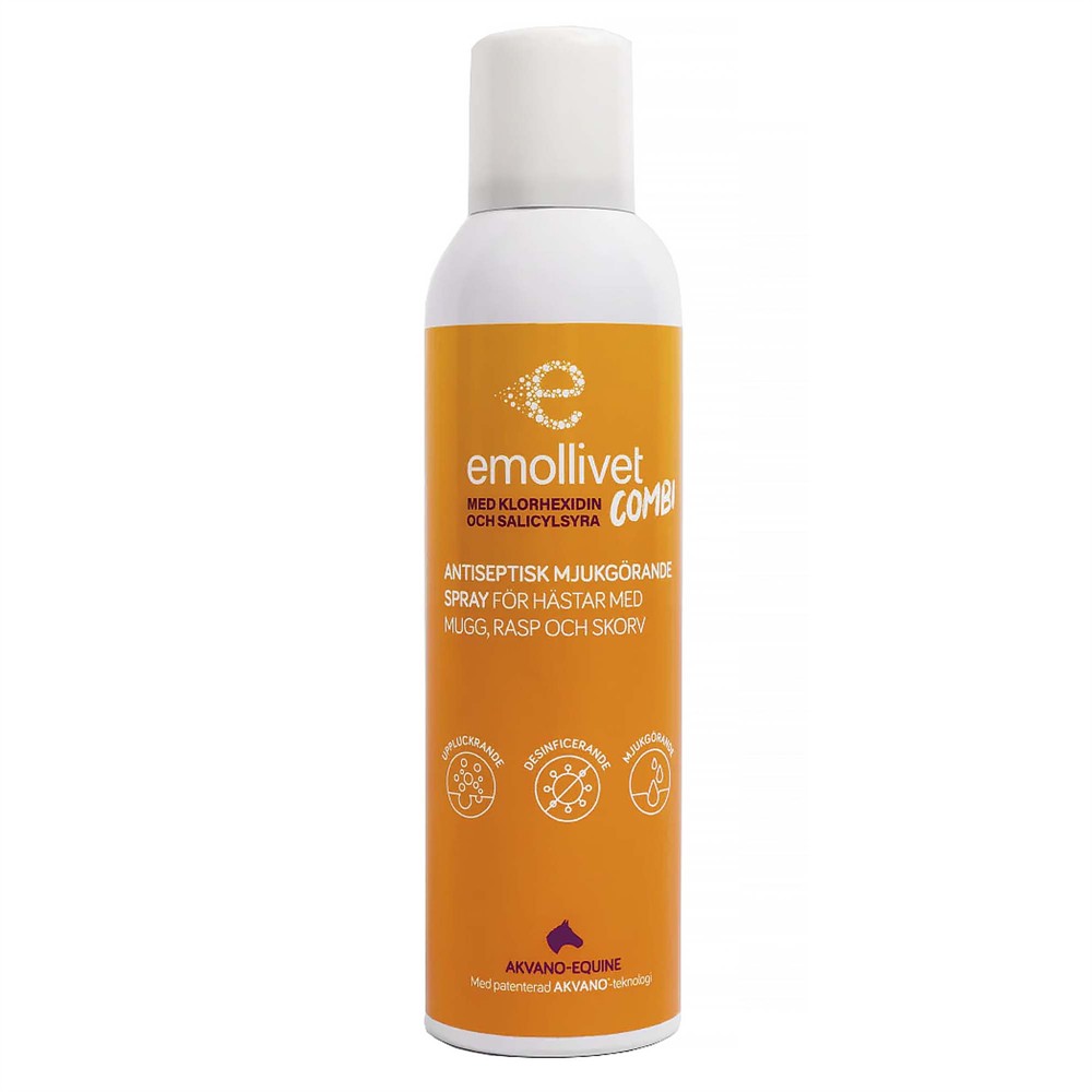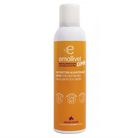 Antiseptisk och mjukgörande spray för hästar med mugg, rasp och skorv. Bygger på den patenterade AKVANO®-teknologin som möjliggör en kombination av salicylsyra 2%, klorhexidin 0,2% och lipider från sojaböna. Emollivet Combi blir därför en komplett produkt med trippel verkan som bara tar några sekunder att applicera.