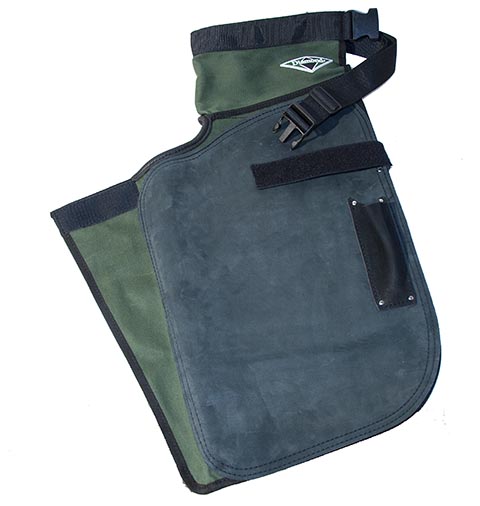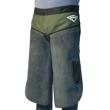 Starka läderdelar på ett kraftigt flamsäkert bomulls förkläde. Två fickor för hovknivar, justerbart snabbfästen i midja.