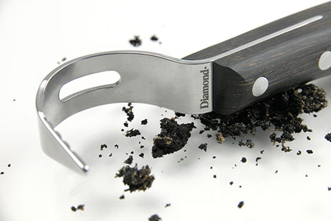 Stark rostfri stålkrok med sågtandade kanter. Designen gör det enkelt att få bort smuts. Bekvämt handtag av hardwood.