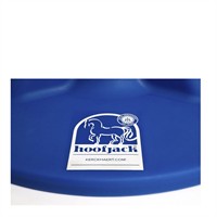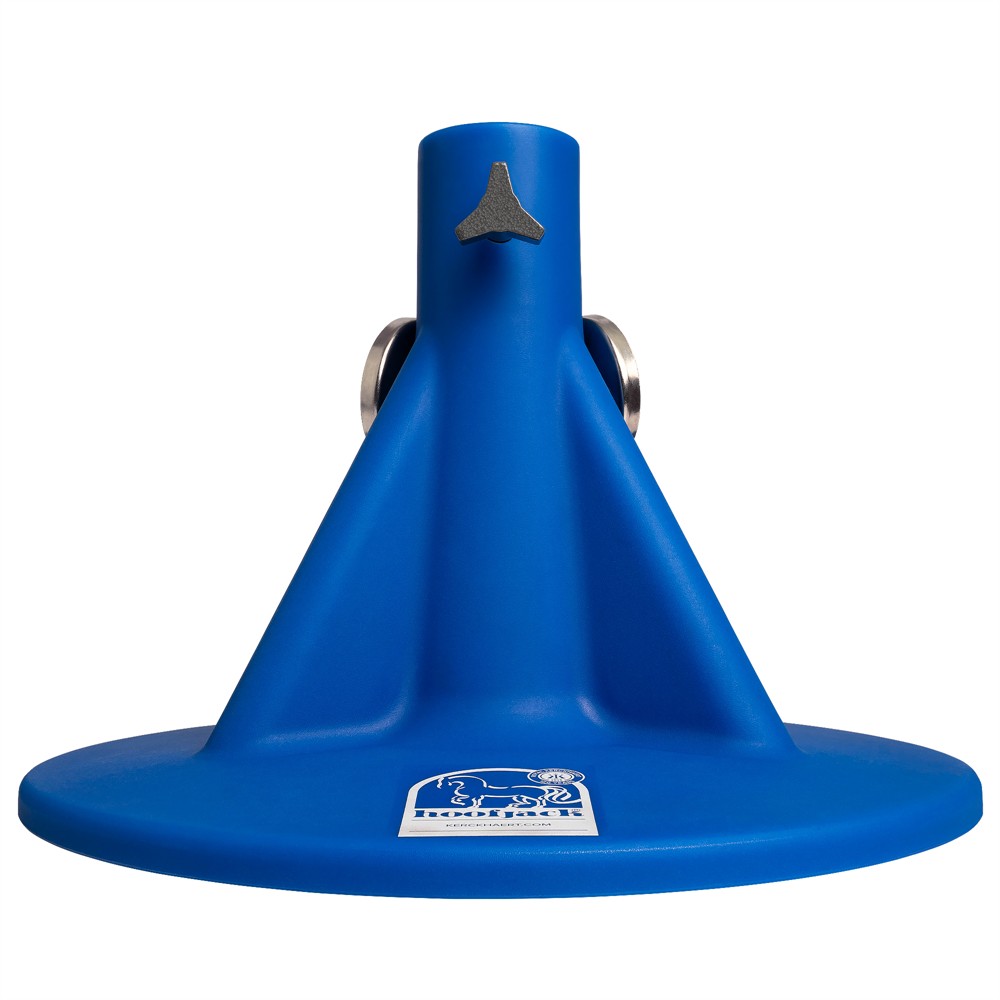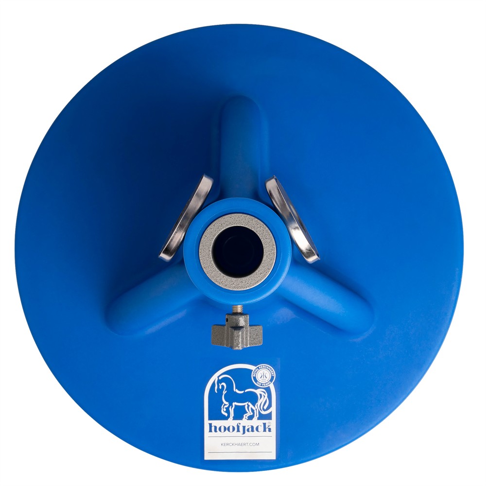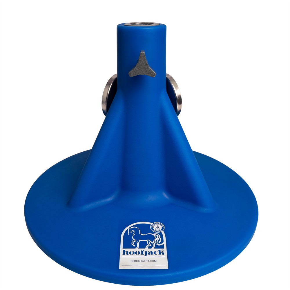 Ett blått standard hoofjack hovstöd med Kerckhaerts tryckta 120-års jubileumslogga på bottenplattan. Jubileums hovstödet säljs i begränsad upplaga EXKLUSIVT under 2026 i samband med firandet av Kerckhaerts 120 års jubileum. Hoofjack är ett stabilt och ergonomiskt hovstöd som underlättar arbetet vid verkning, raspning och skoning genom att ge hoven ett säkert stöd och samtidigt avlasta rygg och knän för den som arbetar.