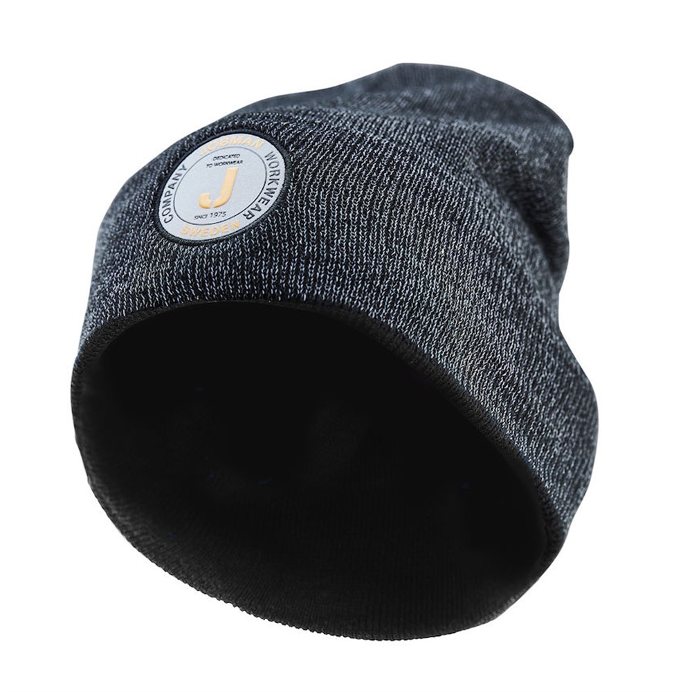 Stickad mössa med uppvik. Inslagen reflextråd ger ett melerat utseende och belyst ger hela mössan en reflekterande effekt. Jobman-etikett i reflex mitt fram. 100% akryl. 40° tvätt.
