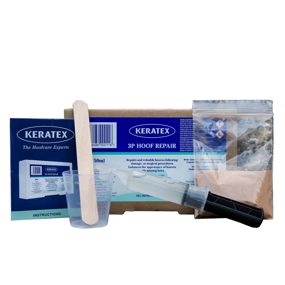 Reparationskit utvecklat för att ersätta och reparera medelstora till stora områden av avsaknat horn eller för att fylla i besvärliga sprickor. Efter grundlig rengöring av hovdelen du vill reparera, blanda pastan enligt anvisningar och använd spateln för att applicera. Epoxihartsen klistras fast på det område du vill reparera, vilket ger dig en halvpermanent filler som efterliknar naturligt hovhorn.