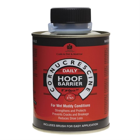 Hovens struktur skadas av snabba skiftningar i fukthalt. Mättnad av hoven under våta vinterförhållanden och torka under sommarmånaderna orsakar enorma fuktobalanser. Den snabba torkningen av mättade och försvagade hovar orsakar molekylär störning, vilket resulterar i synliga sprickor och skador i hoven. Använd Cornucrescine Hovbarriär för dagligt bruk för vattenmättnad i hoven.