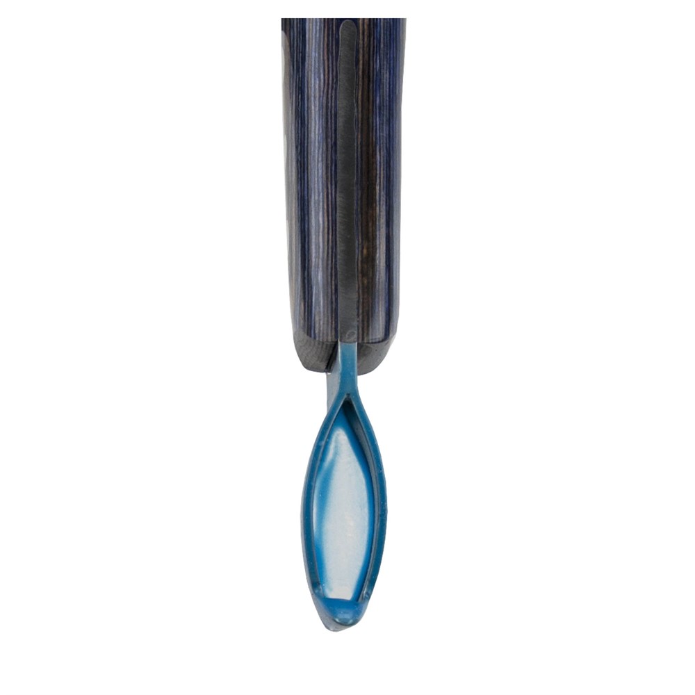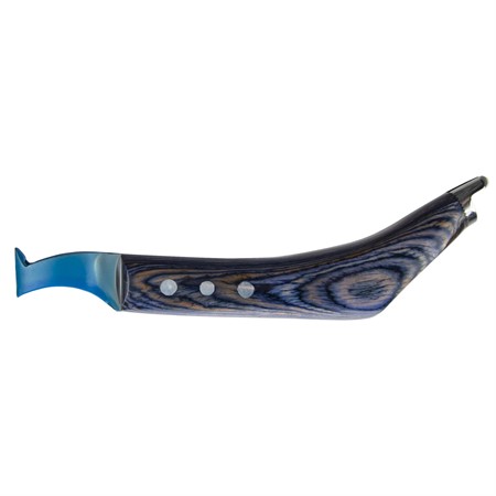 Metallklack med nitförsänkare på botten av kniven. Krok för att kratsa ur hoven på baksidan av knivbladet.