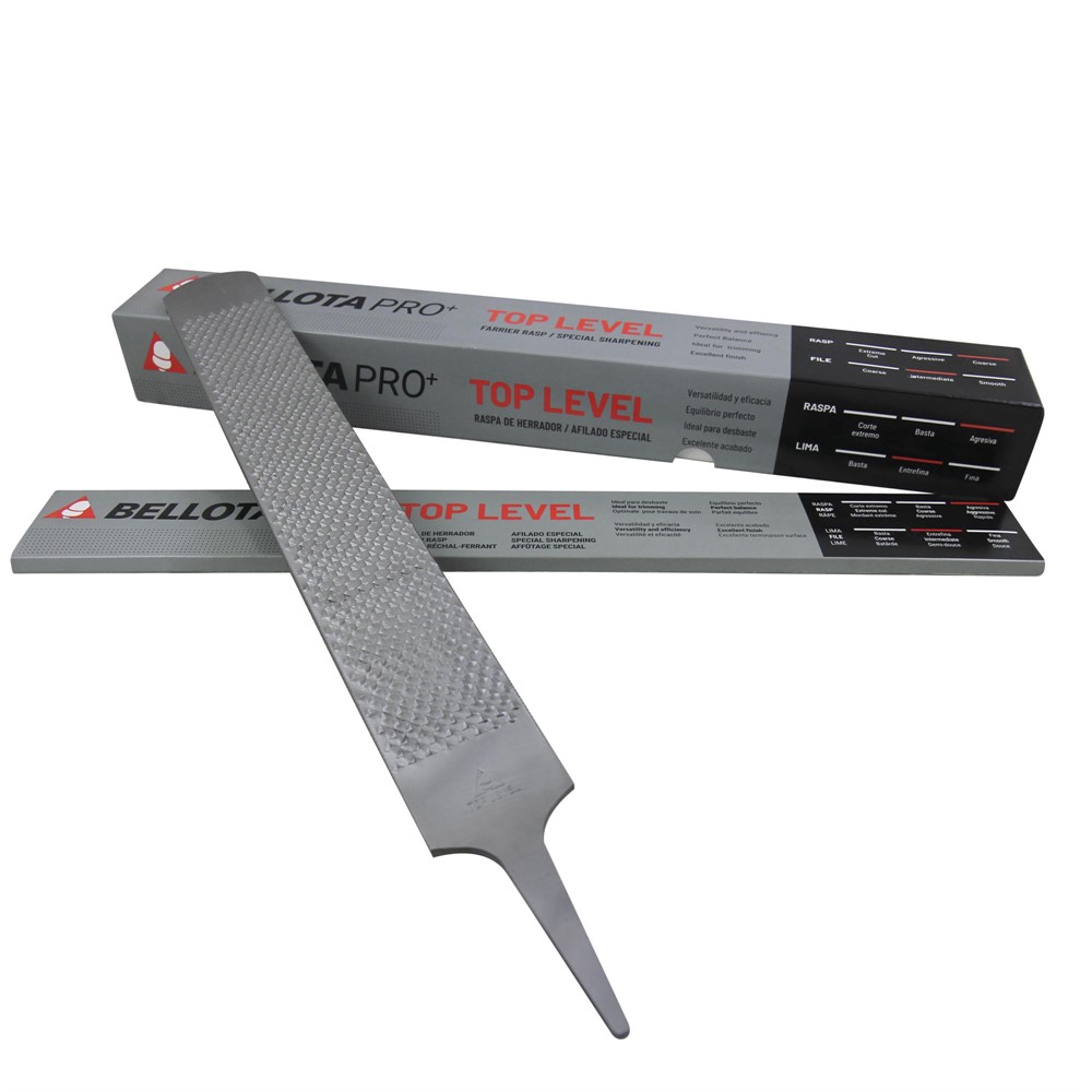 Bellota Top Level är 12% bredare (bredd 50mm) och 10% tunnare än vanliga raspar. Vikten är samma som normala raspmodeller. Med ny aggressivare raspyta (8-tänder/rad) för enklare och snabbare raspning. Mellangrov filsida, lik Top Sharps.